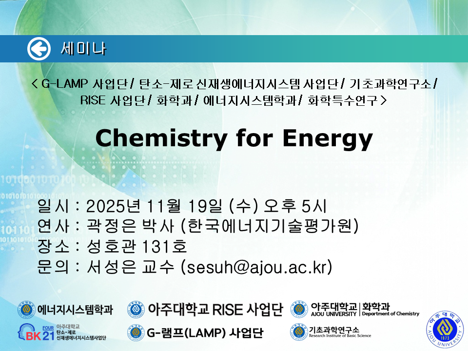 [2025.11.19.(수)] < G-LAMP 사업단 / 탄소-제로 신재생에너지시스템 사업단 / 기초과학연구소 / RISE 사업단 / 화학과 / 에너지시스템학과 / 화학특수연구 > 세미나 안내