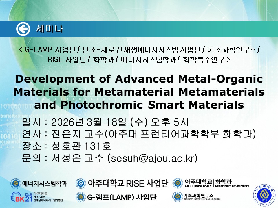 [공지] [2026.03.18.(수)] < G-LAMP 사업단 / 탄소-제로 신재생에너지시스템 사업단 / 기초과학연구소 / RISE 사업단 / 화학과 / 에너지시스템학과 / 화학특수연구 > 세미나 안내