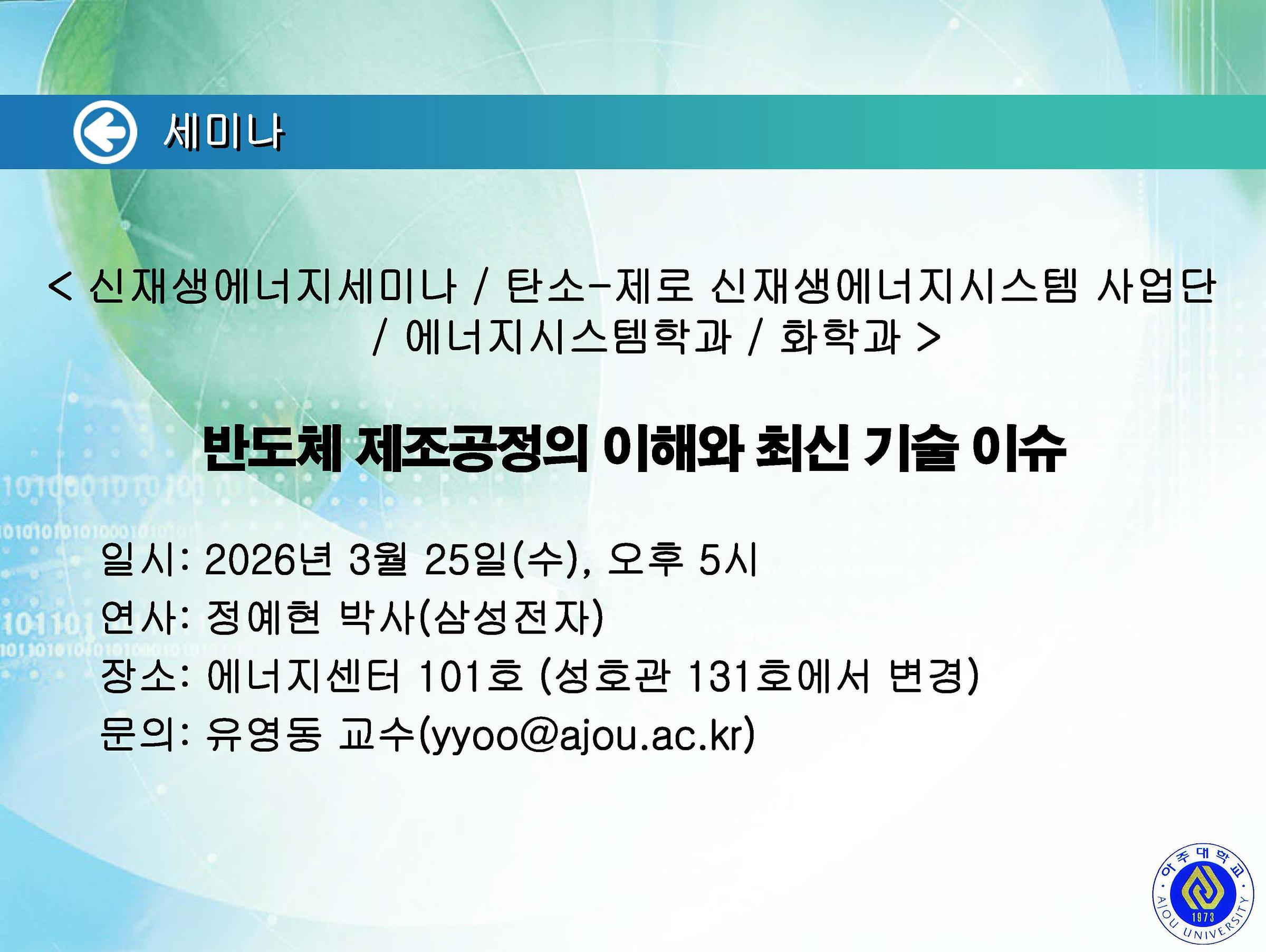 [2026.03.25.(수)] <신재생에너지세미나 / 탄소-제로 신재생에너지시스템 사업단 / 에너지시스템학과 / 화학과 > 세미나 안내