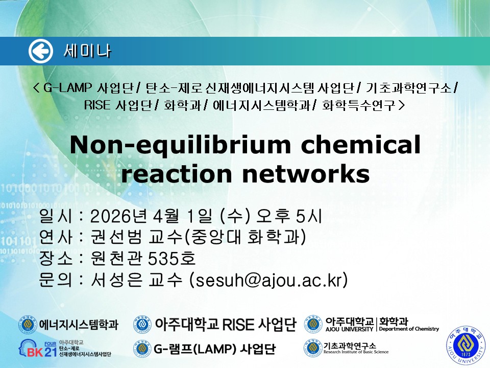 [2026.04.01.(수)] < G-LAMP 사업단 / 탄소-제로 신재생에너지시스템 사업단 / 기초과학연구소 / RISE 사업단 / 화학과 / 에너지시스템학과 / 화학특수연구 > 세미나 안내