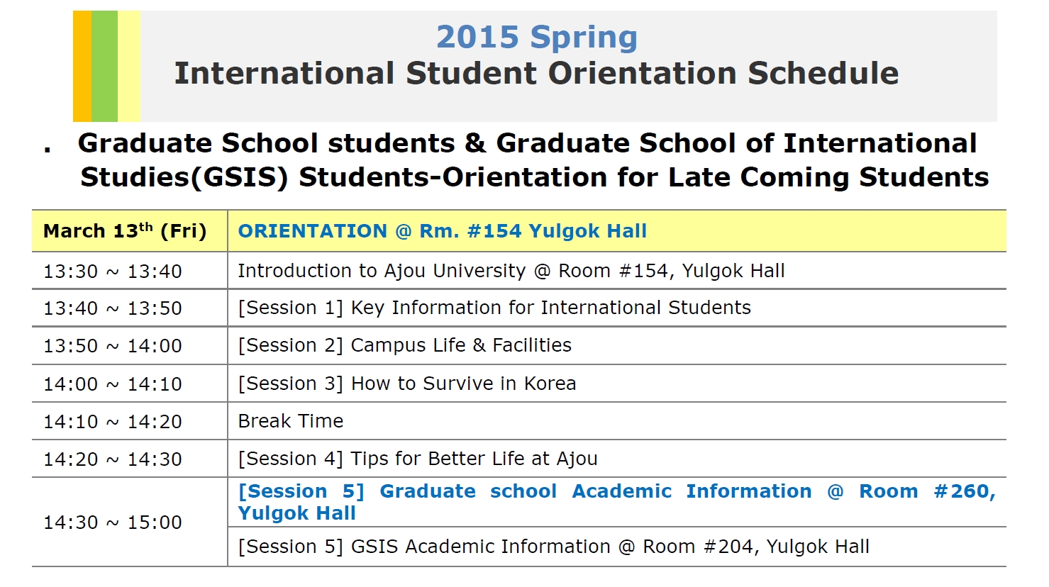 2015학년도 봄학기 외국인 신입생 2차 오리엔테이션 일정