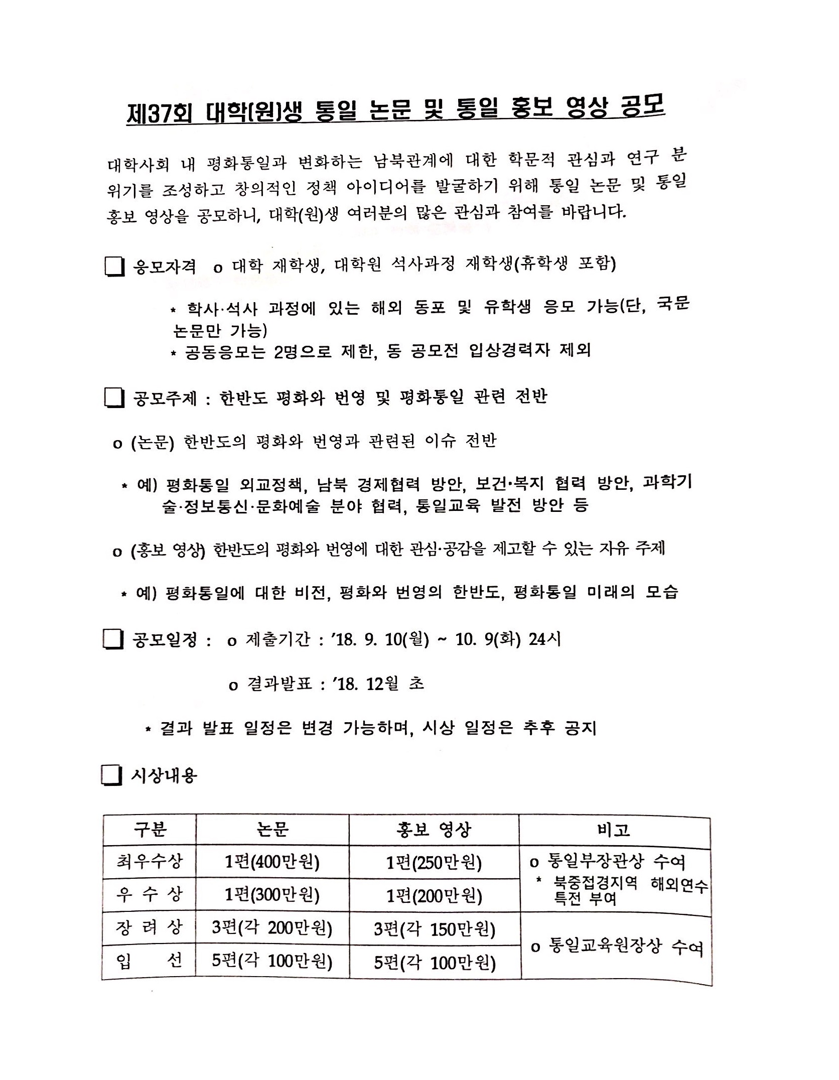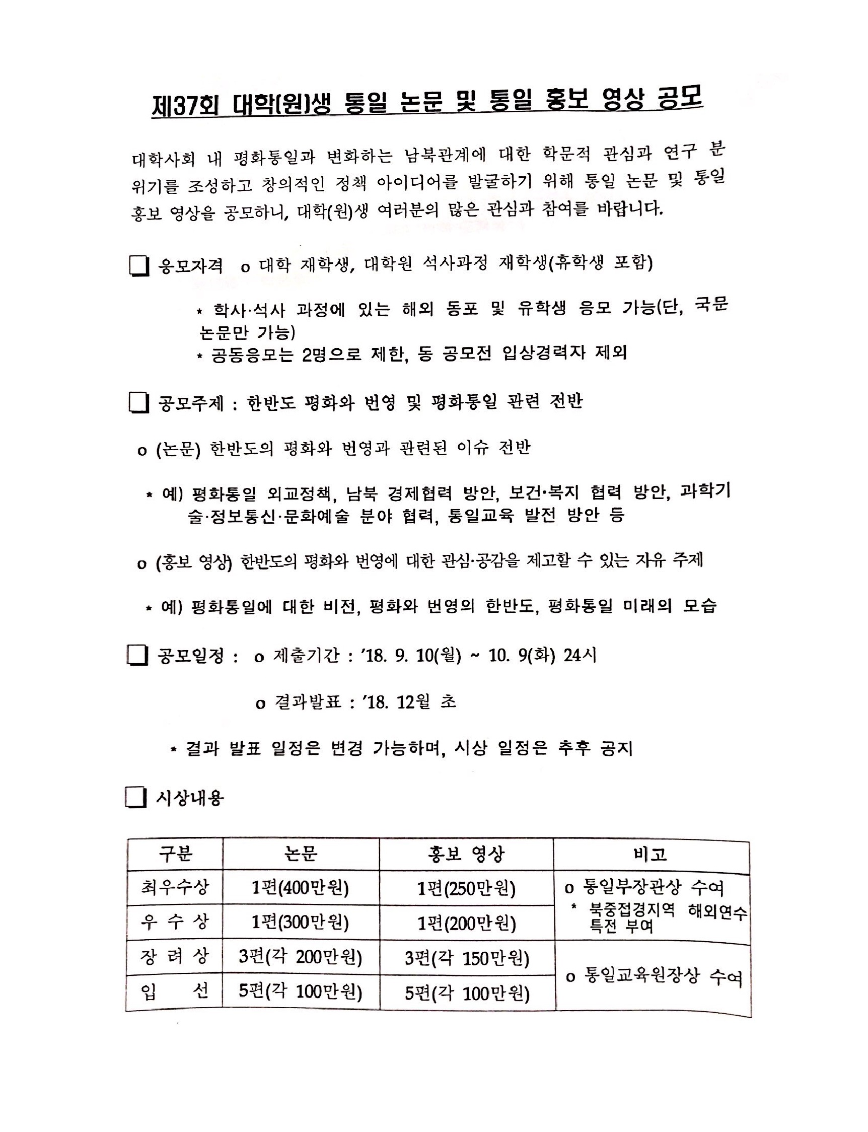제37회 대학(원)생 통일논문 및 통일홍보 영상 현상공모