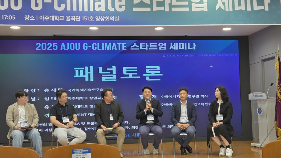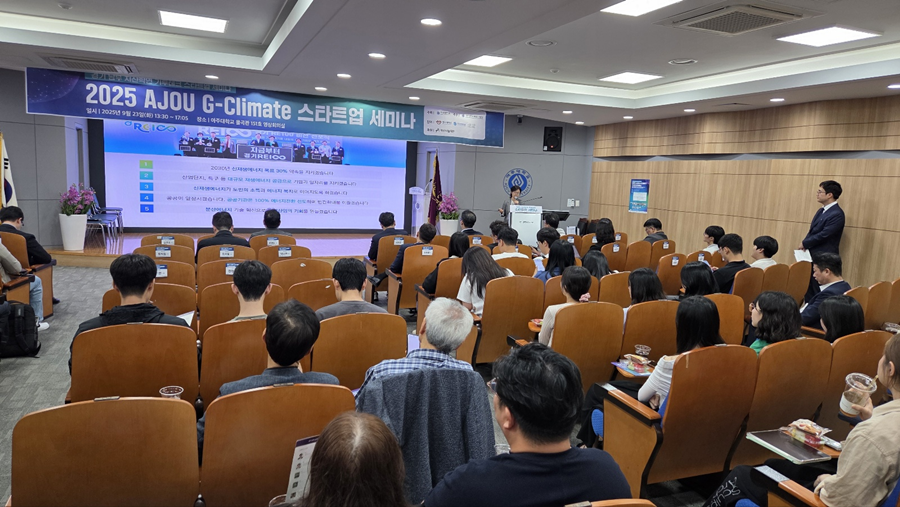 아주대학교가 기후 위기 대응을 위한 기술창업 전략과 지역 기반의 산학연 협력 방안 논의를 위해 ‘2025 AJOU G-Climate 스타트업 세미나’를 지난 23일, 율곡관에서 개최했다.