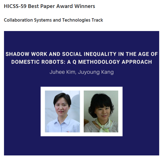 우리 학교 강주영 교수는 대학원 글로벌융합경영학과 김주희 박사과정생과 함께 진행한 연구로 최우수 논문상(Best Paper Award)을 수상했다. 연구팀은 ‘가정용 로봇 시대의 그림자 노동과 사회적 불평등: Q 방법론적 접근(Shadow Work and Social Inequality in the Age of Domestic Robots: A Q Methodology Approach)’이라는 제목의 논문으로 수상의 영예를 안았다.