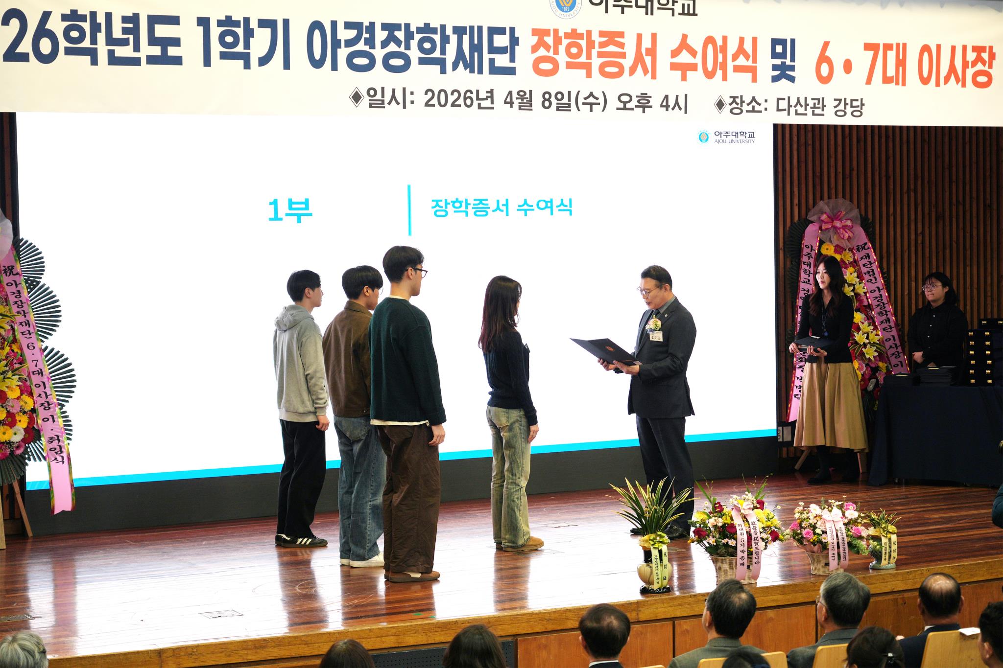 2026학년도 1학기 아경장학재단 장학증서 수여식이 8일 다산관 강당에서 개최됐다. 아경장학재단은 우리 학교 경영대학원 총동문회가 지난 2007년 설립한 장학재단으로, 이날 행사에서는 제 6‧7대 이사장의 이·취임식도 함께 마련됐다.