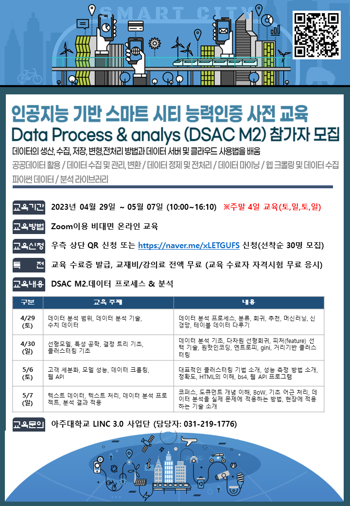[LINC 3.0] (전액무료) 인공지능 기반 스마트 시티 능력인증 사전교육2 (DSAC M2 자격 과정) 참가자 모집(선착순 30명)