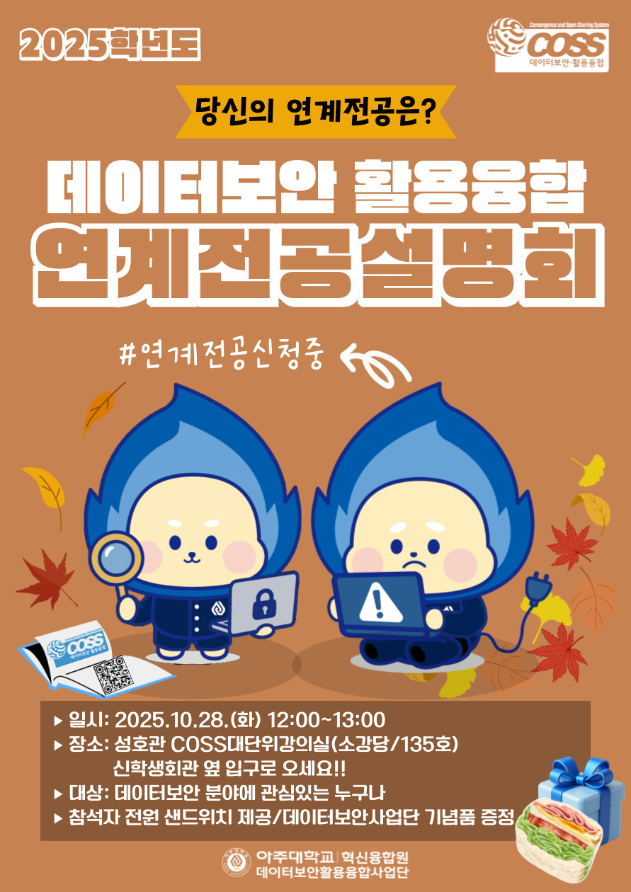 데이터보안에 관심 있는 아주대 재학생이라면 누구나 참석할 수 있으니 오셔서 샌드위치와 기념품도 받으시고 연계전공 정보도 얻어가세요~!
