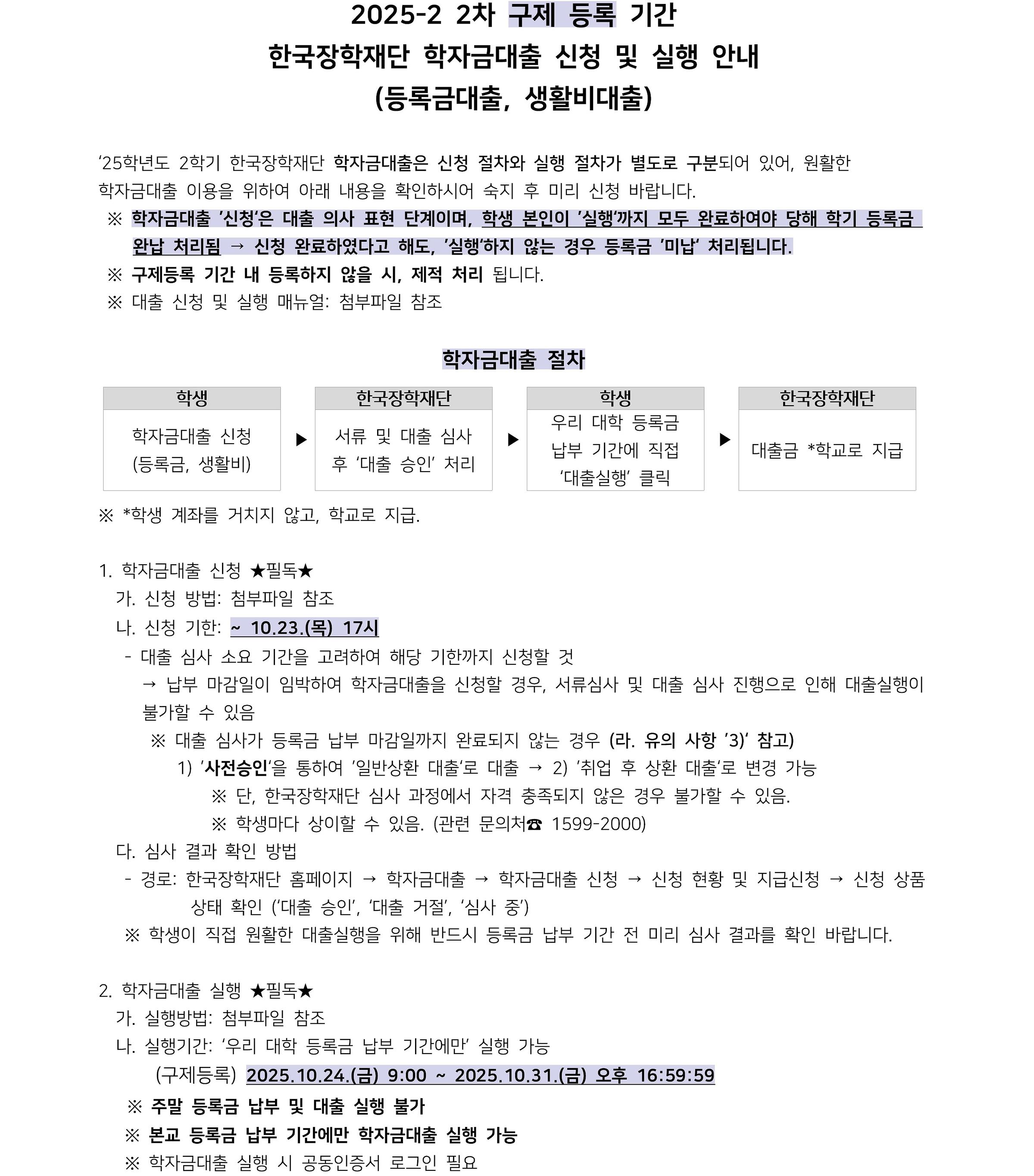 [장학] [학자금대출]최종 구제 등록 기간(10.24.~10.31.) 한국장학재단 학자금대출 신청 및 실행 안내 (등록금대출, 생활비대출)