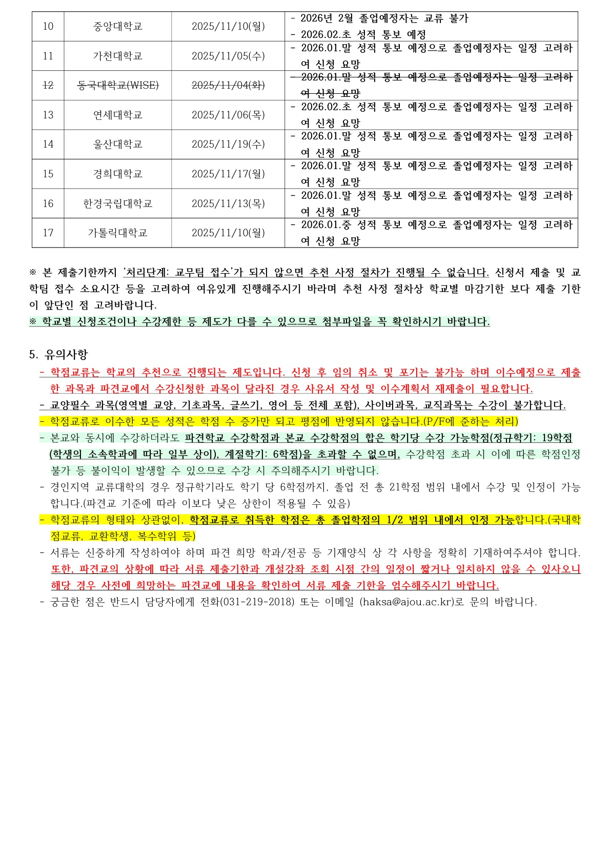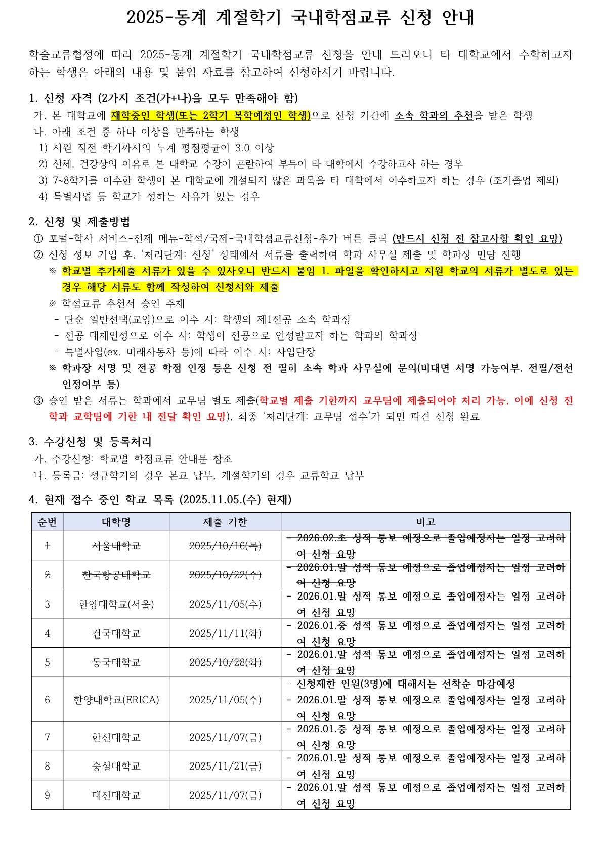 [학사] [학부/학사과정] (25.11.05.)(수정) 2025-동계 계절학기 국내대학 학점교류 신청 안내