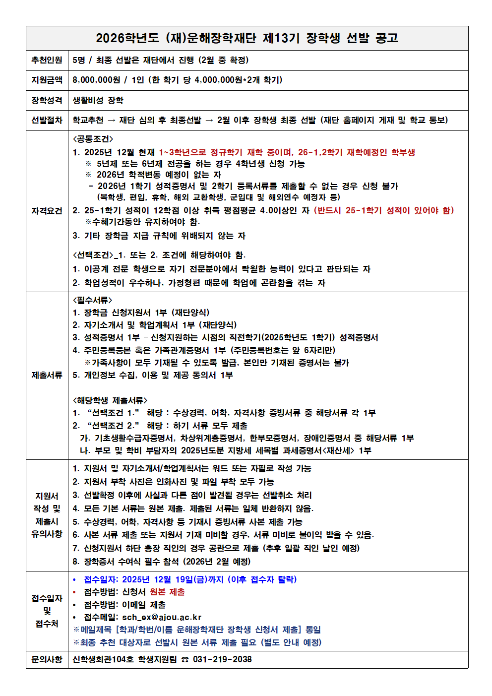 [장학] [교외장학] 2026년도 (재)운해장학생 제13기 장학생 선발 공고 (~12.19.(금)까지)