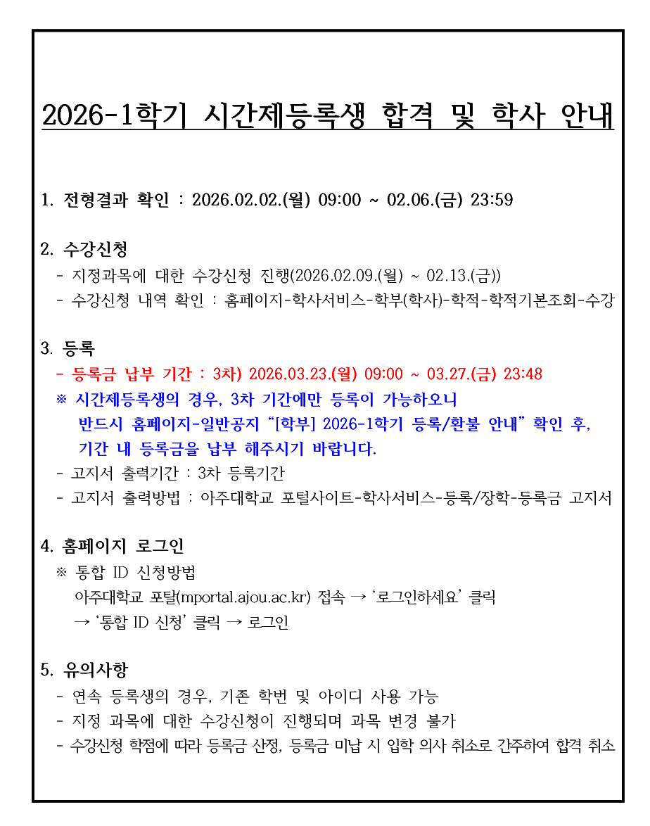 [공지] [학부] 2026-1학기 시간제등록생 전형 결과 안내