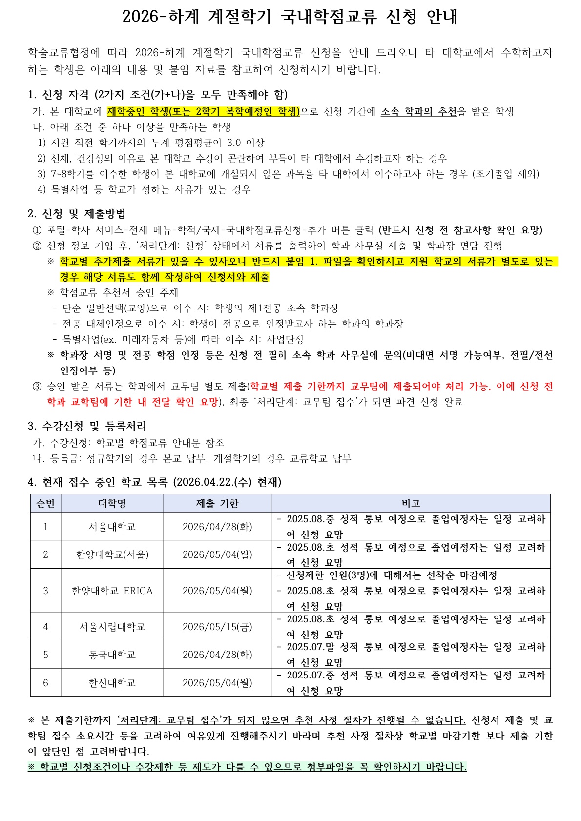 [학사] [학부/학사과정] (26.04.22.)(수정) 2026-하계 계절학기 국내대학 학점교류 신청 안내