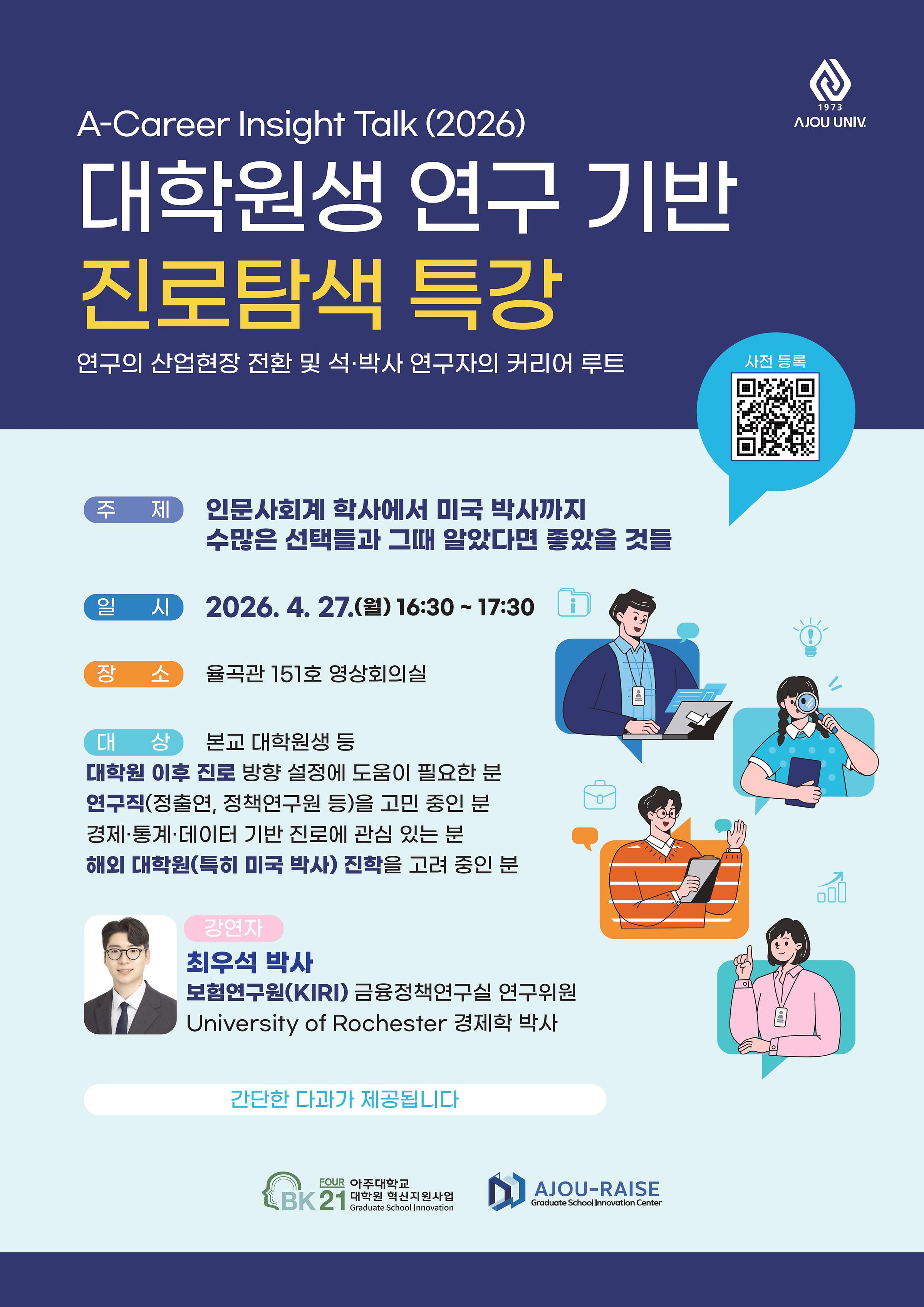 [행사] [BK21대학원혁신] 정출연, 미국 대학원 등으로의 진로 탐색 특강 「A-Career Insight Talk(2026.4.27.)」(KIRI, 최우석 박사)