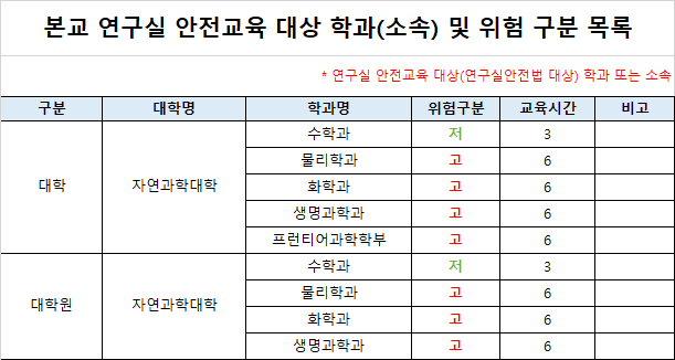 - 저위험학과(연구실): 3시간 / 매년 (1학기 또는 2학기 중 한 학기만 이수 시 요건 충족)