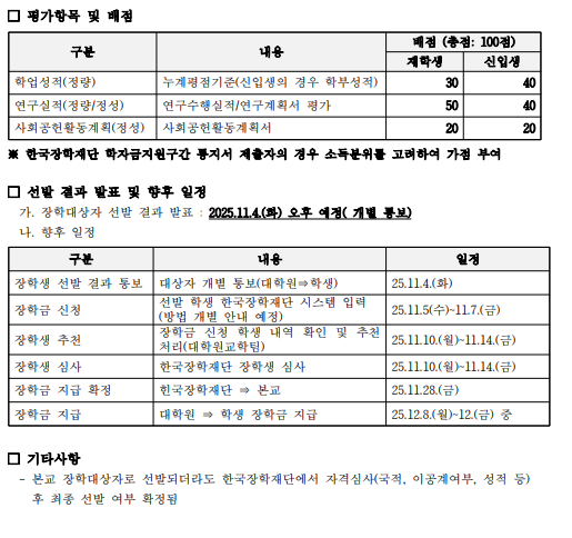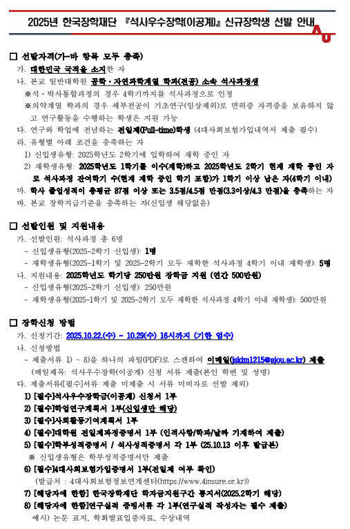 [장학] [자연대/대학원] 2025 한국장학재단 석사우수장학금(이공계) 신규 장학생 선발 안내