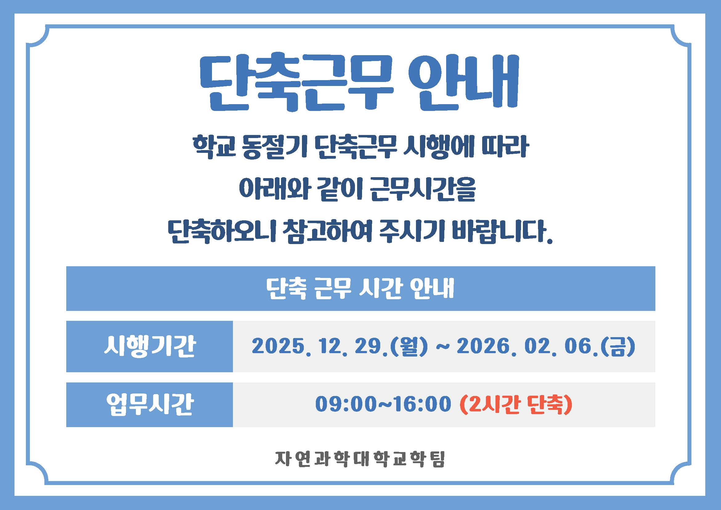 [공지] [자연대교학팀] 2025학년도 동절기 단축근무 시행 안내(12.29(월)~02.06(금))