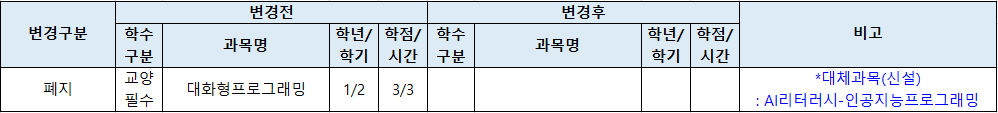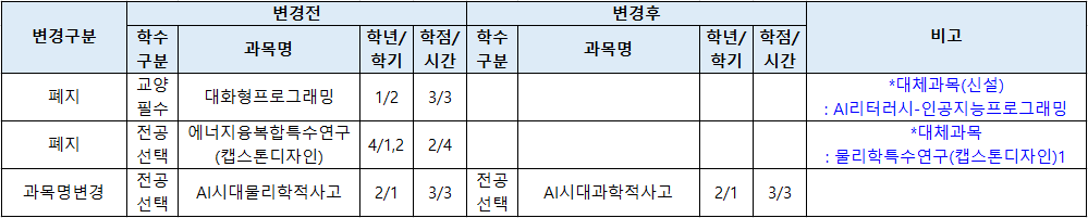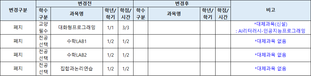2026학년도 교육과정 변경사항을 아래와 같이 안내드리오니, 수강신청 시 참고하여 주시기 바랍니다.
