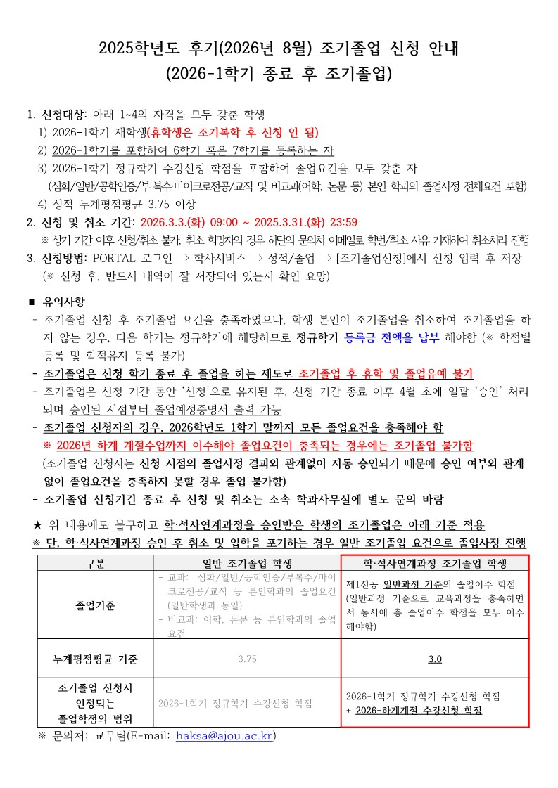 [학사] [학부/학사과정]2025학년도 후기(2026년 8월) 조기졸업 신청 안내