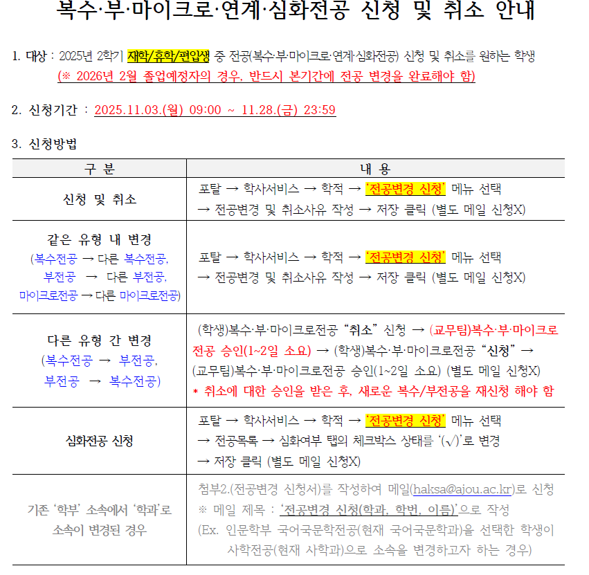 [공지] [학부] 전공(복수,부,마이크로,연계,심화전공) 신청 및 취소 기간 안내 (11.3.~11.28.)