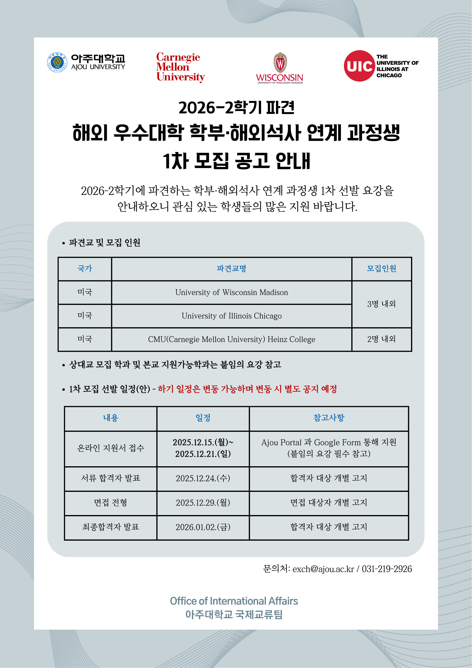 2026-2학기 파견 해외 우수대학 학부 및 해외석사 연계 과정생 모집 안내 주요 사항