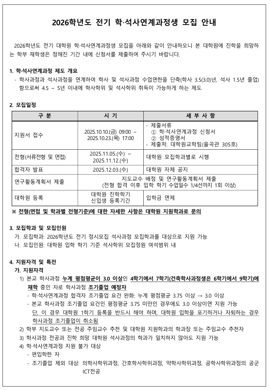 1. 2026 전기 학석사연계과정생 모집 안내문