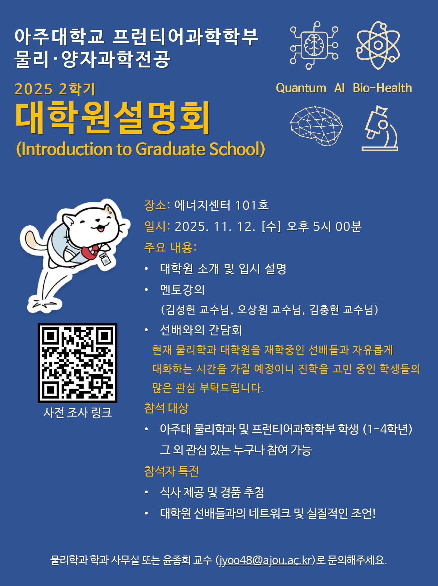 2026학년도 대학원의 날을 맞아 물리학과에서 대학원 설명회를 아래와 같이 진행할 예정입니다.